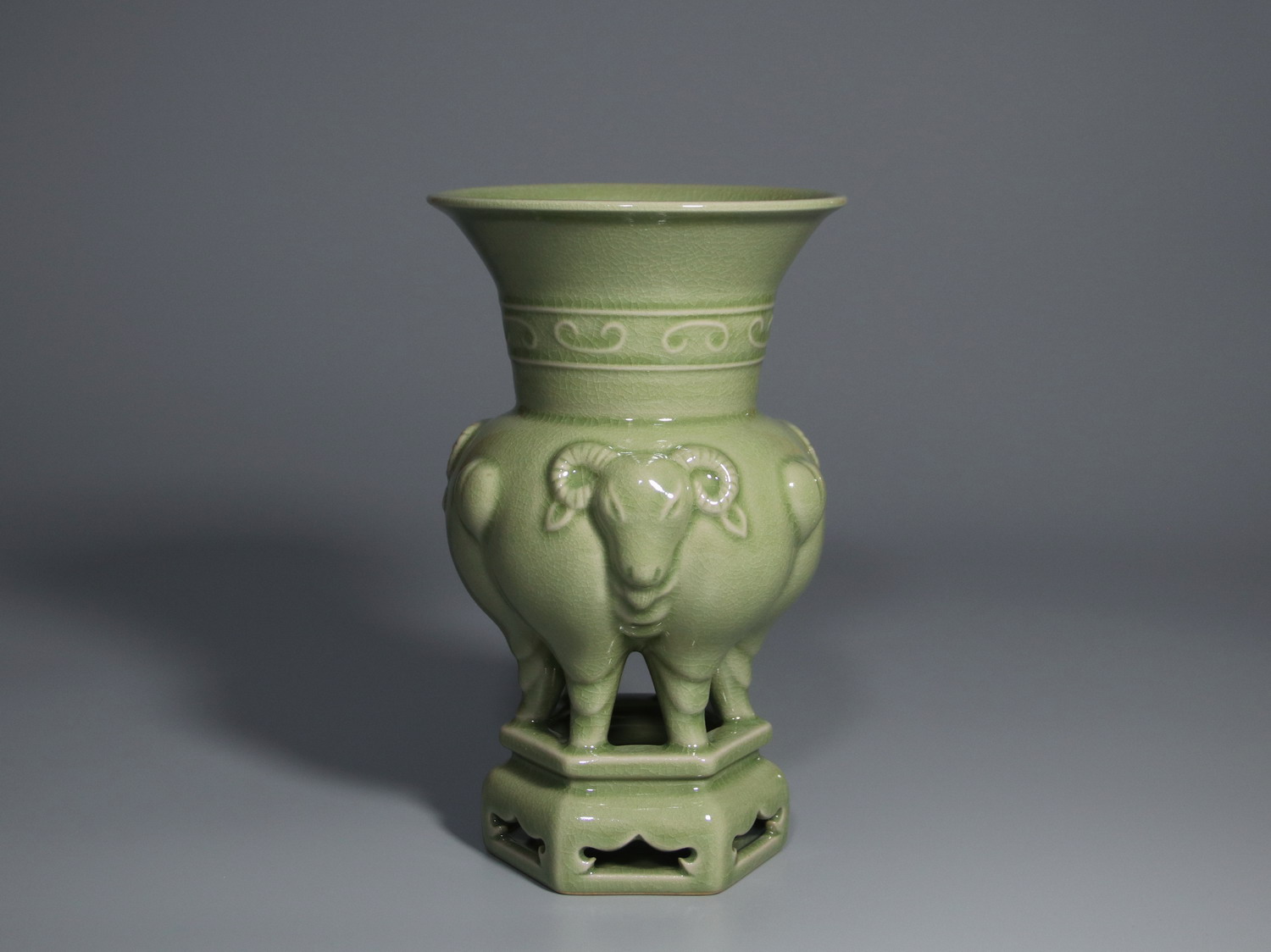 作品简介: 三牺尊,原名“三阳(羊)开泰”器分上、中、下三部分,上部侈圆口、长颈、腹塑三羊、颈部凸起弦纹二道,间饰正、反云纹一周。中部以三羊并体为腹,三首、三尾相间,羊首写实,大弯角、双耳及须,生动清晰,羊身肥壮略为夸张,尾呈心形,头尾相对相称,背托尊器,六足分立于台座之上。下部台座成六角形,镂空,座足呈如意形,平底。牺尊造型怪异,施釉肥润,深绿浑厚,温润可人。整体施玛瑙釉,豆绿色,细碎纹片密布,棱角间显露黄骨。“三牺尊”以三羊作器谐音“三羊(阳)开泰”寓意吉祥,烧制讲究。此件整器神完气足,制作极其规整,为传世汝瓷罕见之精品。