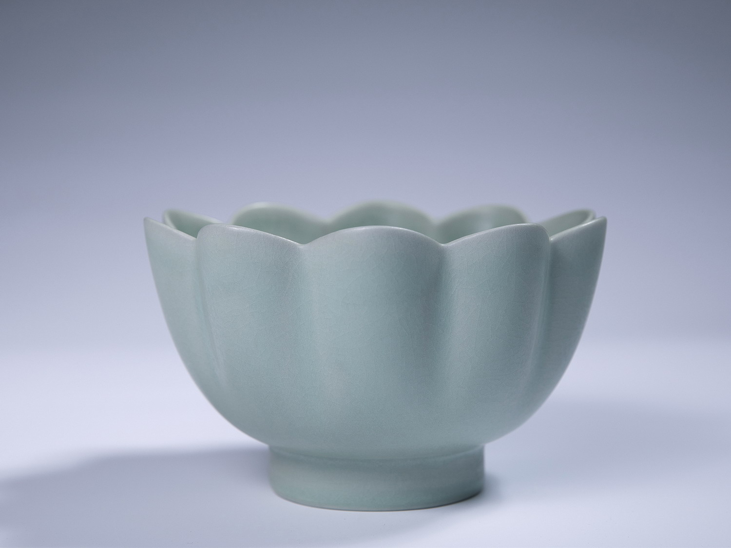 作品简介: 宋代经典器型,此莲花碗呈十瓣莲花形,造型比例适度,器身随花口亦呈十瓣,形似一朵盛开的花朵,凸凹与莲口相衔接,显得格外协调自然,美观大方,充分表现出莲花开放之势。天青釉匀净之温润,颇具艺术风韵,集观赏与实用为一体。通体满釉支钉支烧,玛瑙入釉,釉层如玉,似玉非玉胜似玉,滋润细腻,开片密布,釉质莹润工艺精美,具有很高的艺术欣赏与使用价值