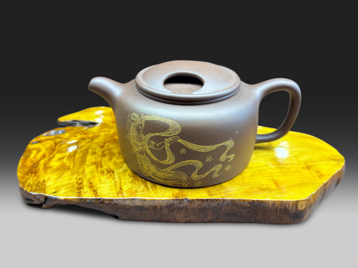 作品简介: 15.3*10.3*7 牛鼻造型的紫砂壶,飞天图案装饰,展现出飘逸灵动的美感。