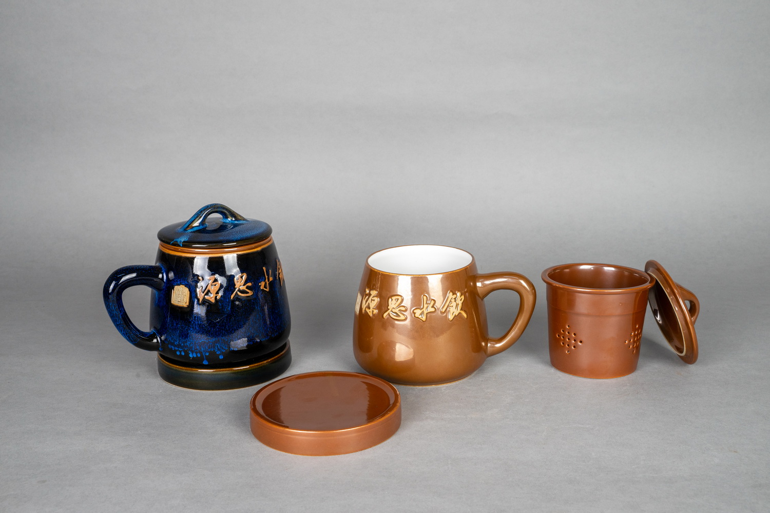 作品简介: 四件套 这款茶杯为杯身、杯盖、内漏、底托四组合设计,打破了众多茶杯的固有模式,内漏可以过滤茶渣,黄、蓝双色釉适应不同人的需求,,杯身“饮水思源” 字样,为品茗增添仪式感和意趣。