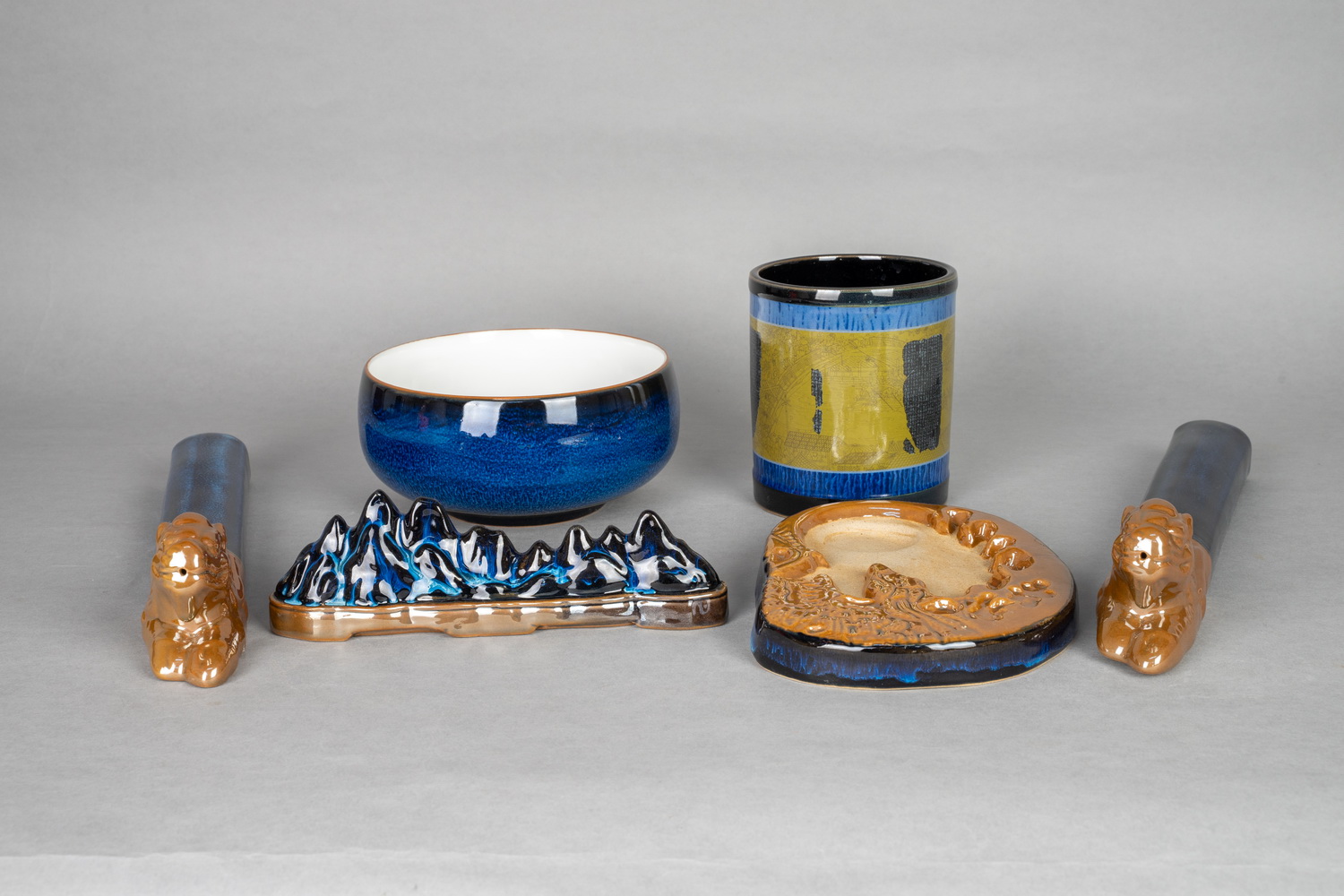 作品简介: 六件套 《文墨翰宝》是一组文房套装。笔筒贴烧《清明上河图》和“元次山碑帖”;砚台雕刻唐代鲁山县令元德秀琴台善政图案;笔架为连绵起伏的尧山山景;镇尺为两樽安卧的祥瑞麒麟。搭配合理,尺寸适中。既具实用性,又融入了丰富的文化元素。是爵士显贵,文人墨客,书画学子收藏把玩志在必得之良器,也是馈赠友人的绝佳之作。