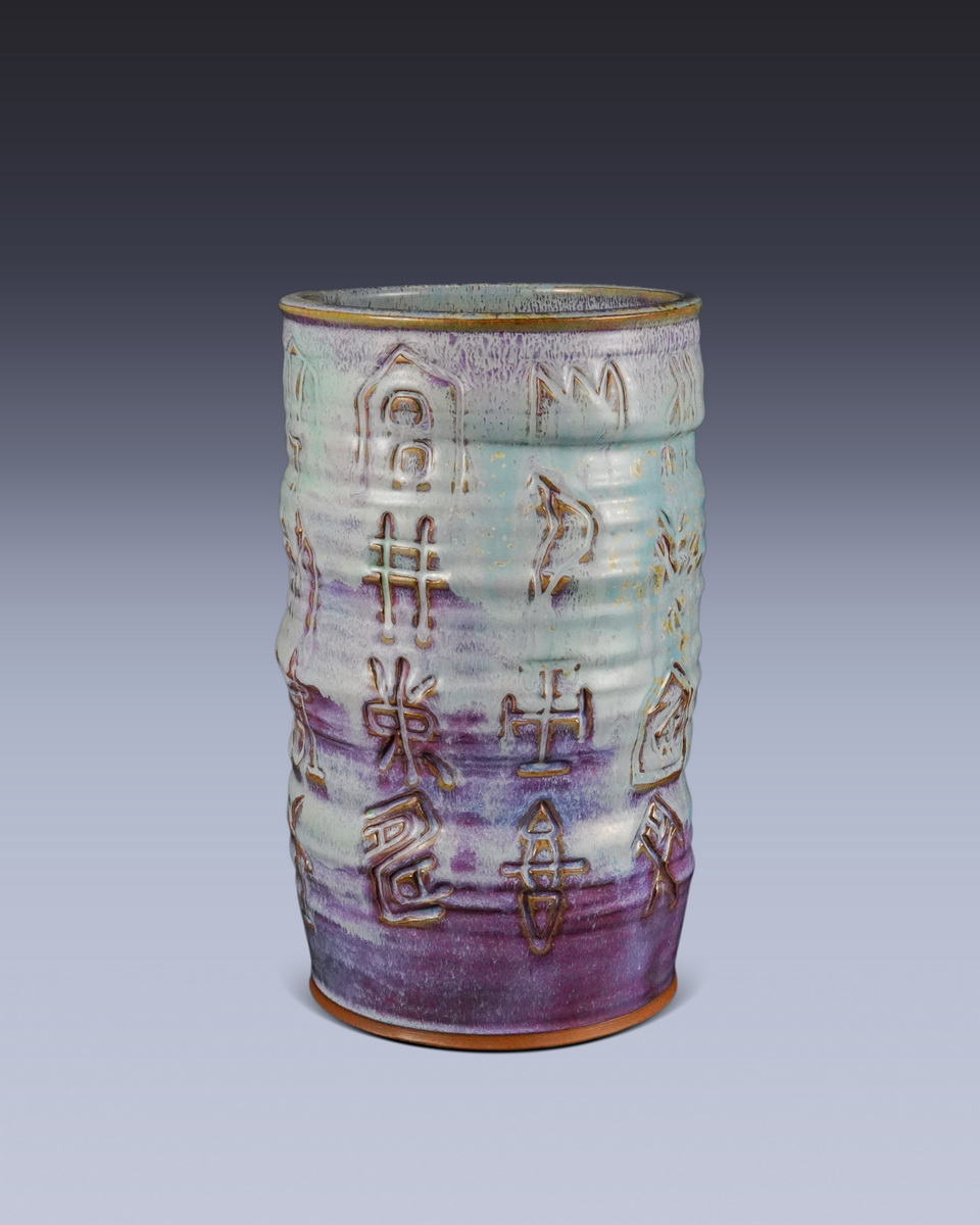 作品简介: 36×18 《步步高升》采用直筒形瓶身,瓶体做分层/阶梯状的凸起纹理设计,模拟“台阶”的形态;瓶身修长挺拔,线条简洁却富有层次感,既保留了钧瓷瓶器的端庄感,又通过造型具象化吉祥寓意。通体施钧瓷窑变釉,以天青、月白为基底,间杂紫、红窑变斑纹,瓶身的阶梯纹理让釉色形成自然的层次过渡,凸起处釉色较浅、凹陷处釉色浓郁,釉面莹润透亮,窑变纹理自然流畅,体现了钧瓷“入窑一色,出窑万彩”的工艺特色。同时,钧瓷的工艺价值也让其兼具陈设观赏与收藏属性。