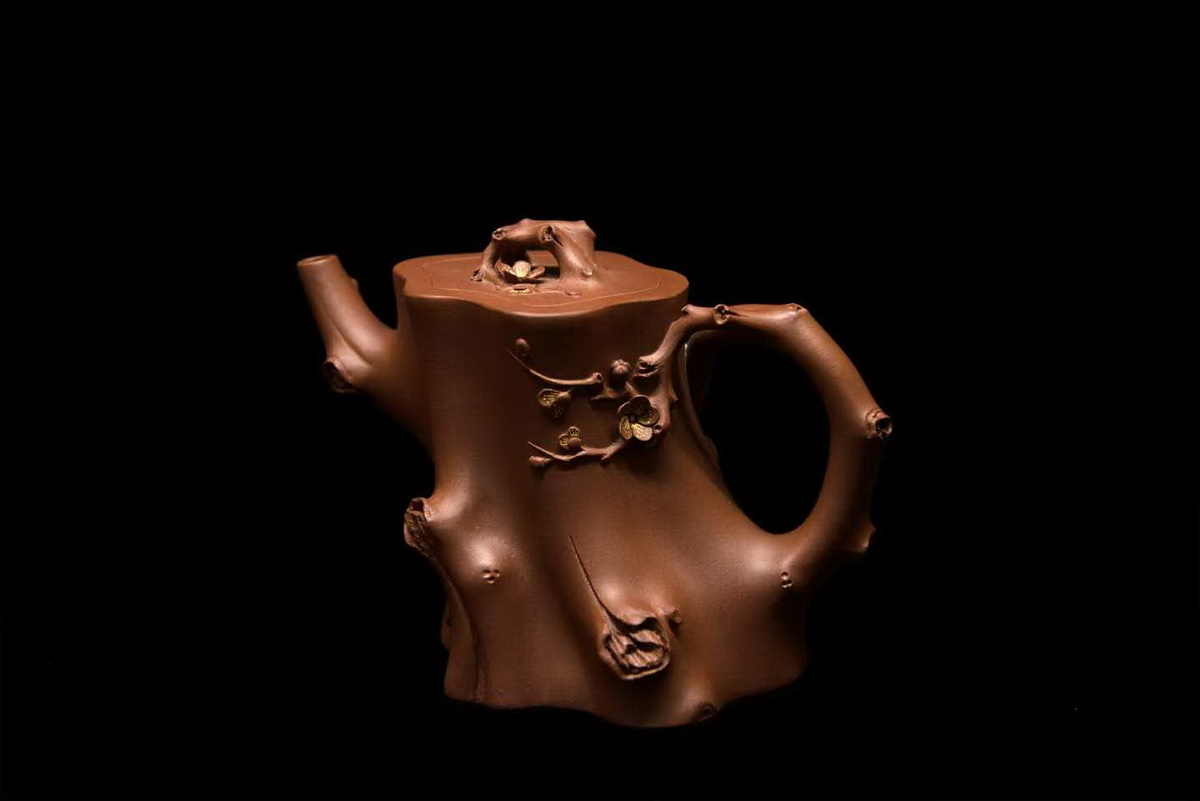 作品简介: 下大上小,呈左倾姿态。弧度缓和的长流,平衡了壶身倾斜的不稳感。梅枝弯成壶把和壶钮。几朵梅花在壶身疏朗布局,树皮纹路雕琢得素洁雅致。给人一种傲骨临风之感。