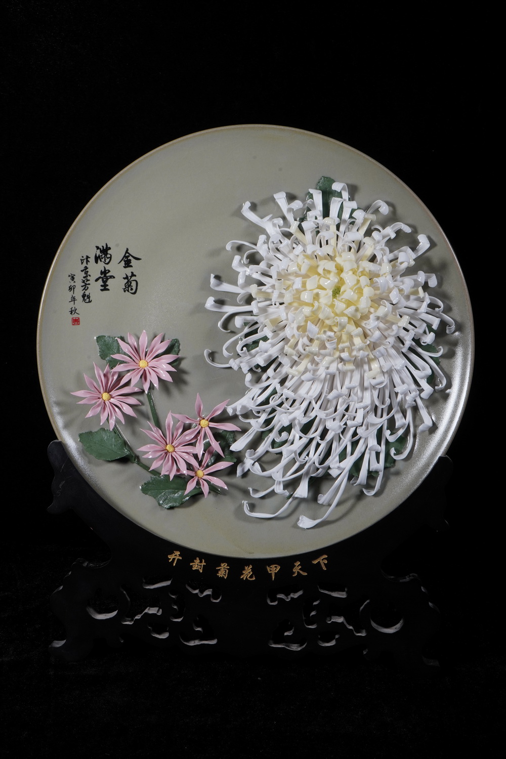 作品简介: 规格:11寸 (29cm) l 12寸(32cm) l 14寸(35cm)菊花象征着淡泊名利,陶渊 明放弃名利,隐居深山,过 着清贫却快乐的生活,因此 菊花也被视为淡泊名利的象征。