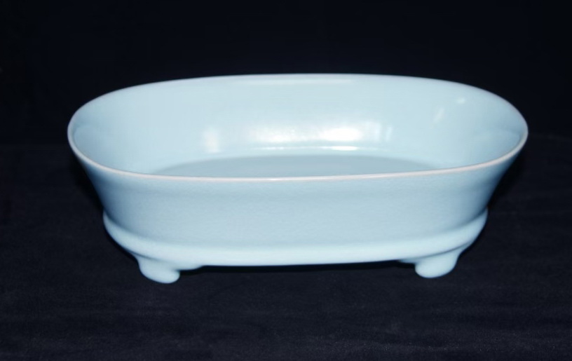 作品简介: 汝瓷水仙盆 作品介绍: 天青釉色温润淡雅,椭圆盆体配三足,线条流畅无纹饰,工艺精湛,尽显自然质朴的宋代美学理念。
