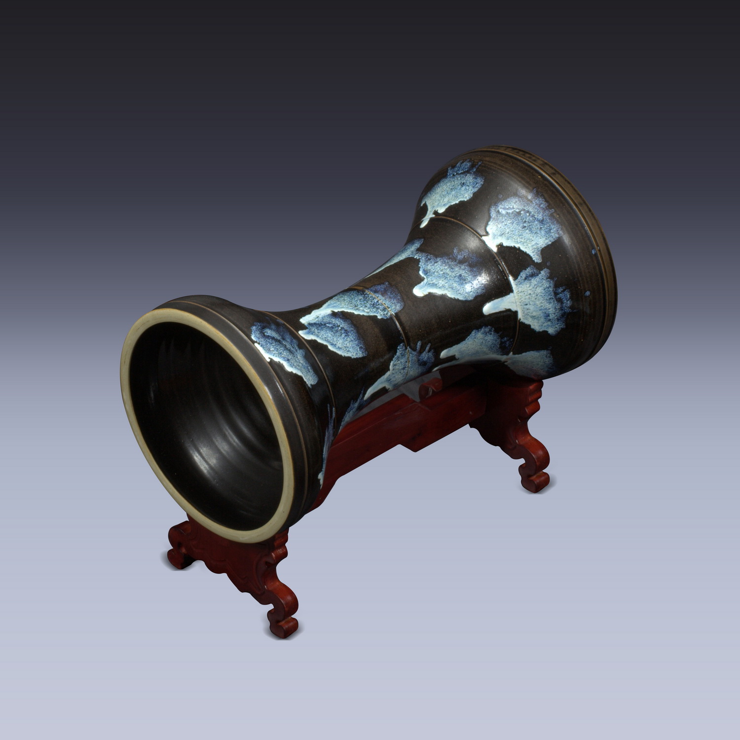 作品简介: 口径:13cm 宽:30cm腰鼓广口、纤腰,鼓身凸起弦纹7道。通体以花釉为饰,宛如黑色闪缎上的彩饰,优美典雅。