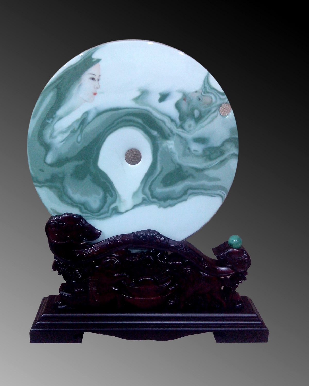 作品简介: 作品名称:《中华壁》 规格:直径31cm 作品为绞胎自然纹高温烧制,绞胎花纹自然形成双龙合璧形象。左上边呈现女娲形象,右上边呈现伏羲形象。象征中华人文始祖,开启华夏文明!